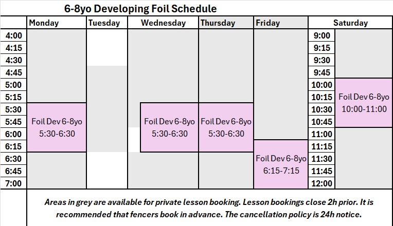 - Once fencers are doing minimum two practices and one private lesson per week, they are welcome to follow the Competitive Schedule. The Competitive Schedule for 6-8yos includes one additional class and additional Supervised Bouting time after class.